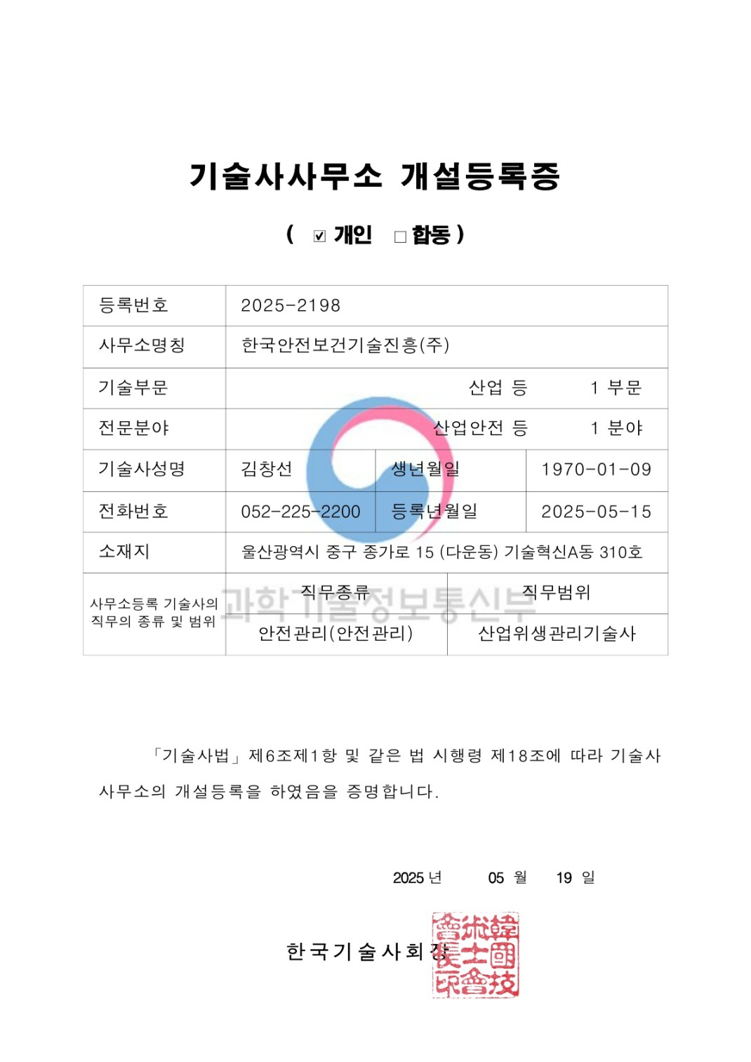 기술사사무소 등록증