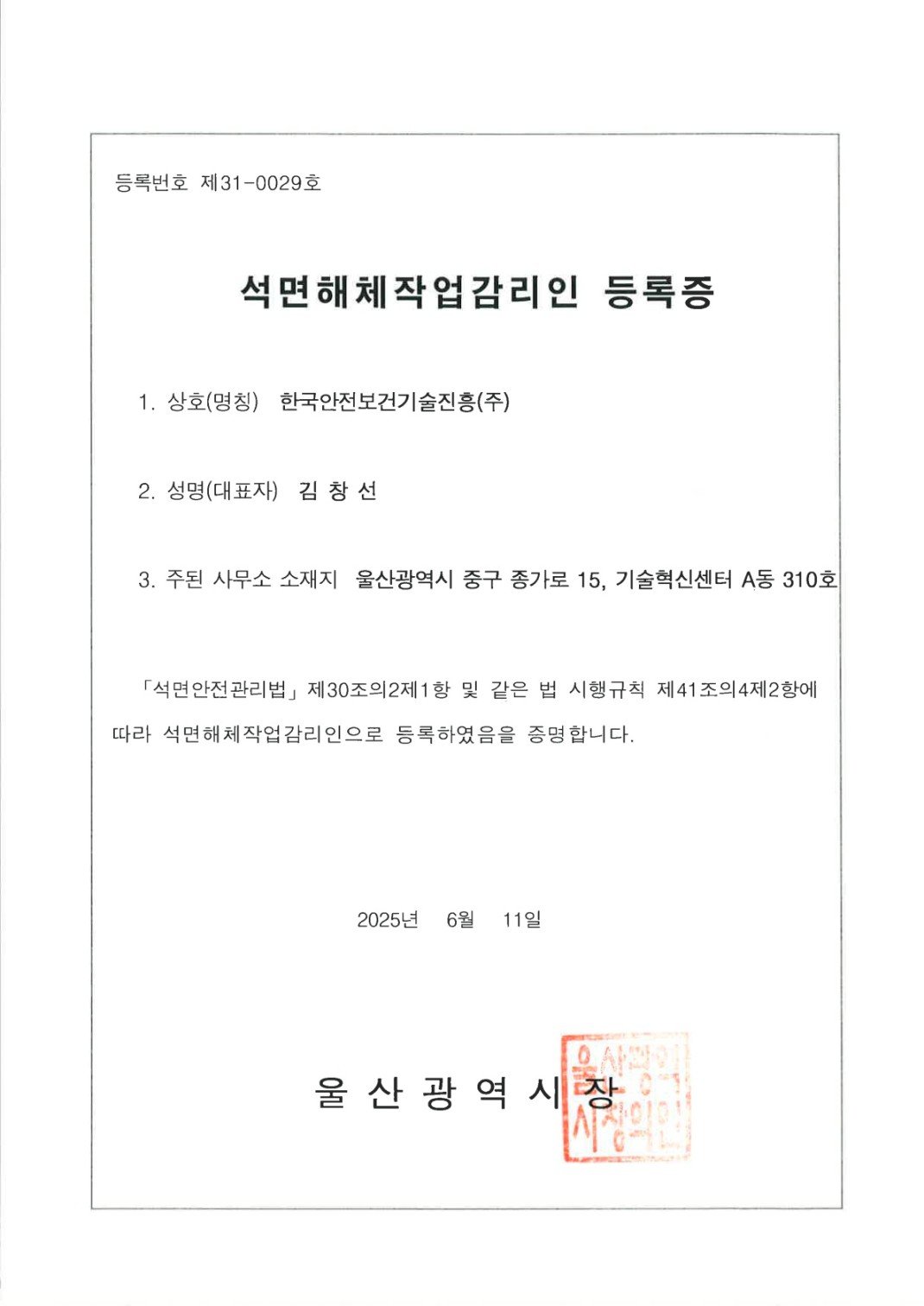 업체명 : 한국안전보건기술진흥 주식회사 ㅣ 사업자등록번호 : 330-87-03194 ㅣ 대표자 : 김창선